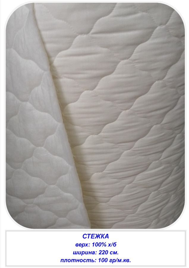 Стежка для покрывала – верх х/б 100%, дублированный синтепоном, плотность 100 гр/м², ширина 220 см., цена – 380 рублей.