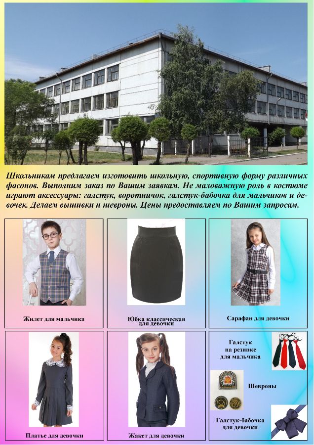 Для школ шьем школьную форму по индивидуальным размерам и предлагаем ткани для школьной формы. Разрабатываем логотипы и делаем флаги. Шьем спортивную форму для команд по футболу и волейболу. Шьем карнавальные костюмы, ростовые куклы.