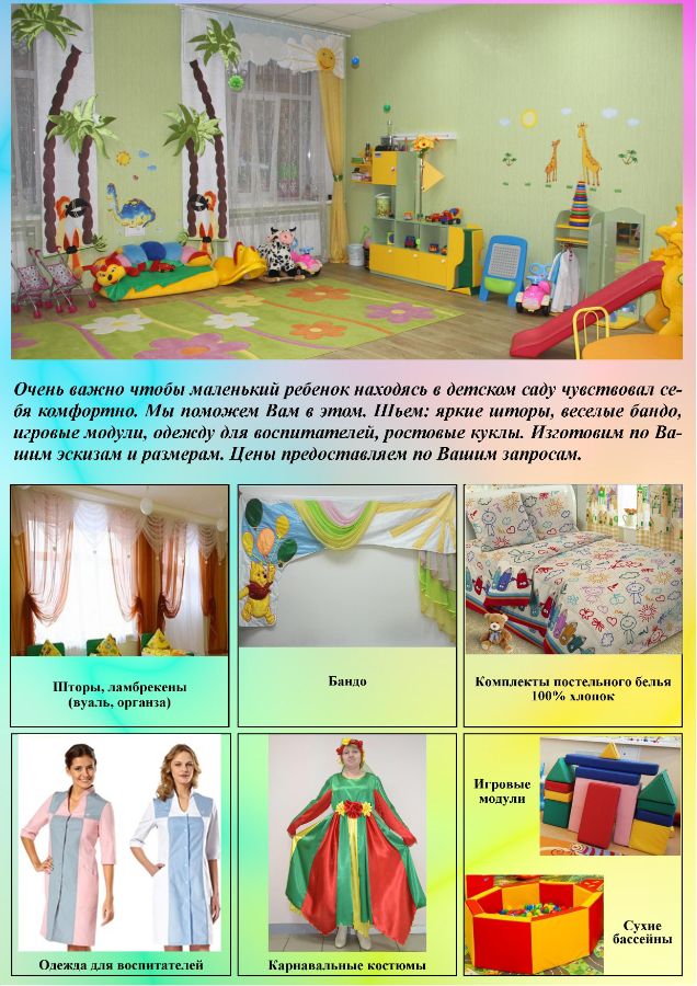 Для дошкольных учреждений шьем и поставляем: постельное белье по Вашим размерам, матрасы, одеяло, подушки, покрывало, ковры, игровые модули, бескаркасную мебель, одежду для персонала и спортивную форму. Шьем карнавальные и сценические (тематические) костюмы, ростовые куклы, шторы, ламбрекены и бандо. Оформляем музыкальные залы.